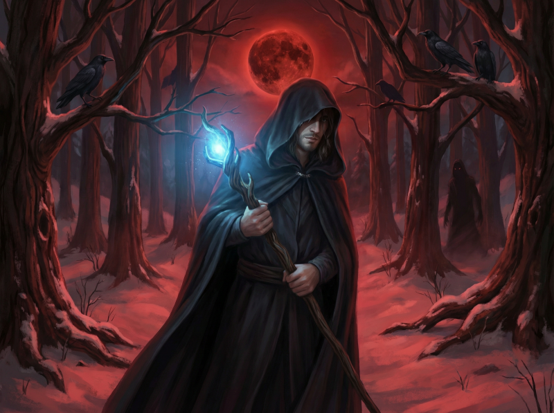 Hinter Morgana erklingt eine Stimme, so tief und resonant wie das Läuten einer unterirdischen Glocke, die das unheilige Schweigen der Lichtung zerreißt. Aus dem wirbelnden Dunst des Blutmondes schält sich eine Gestalt in einem schweren, dunklen Gewand. Jeder Schritt der Erscheinung ist gemessen, getragen von einer Autorität, die selbst die Wächterin erzittern lässt.